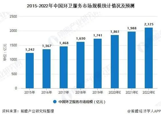 從2015年-2020年,我國環(huán)衛(wèi)服務市場規(guī)模不斷擴大,2019年市場規(guī)模約為1741億元,預計2020年-2022年將以平均復合增長率7%持續(xù)增長,2022年將超過2000億人民幣的市場規(guī)模。