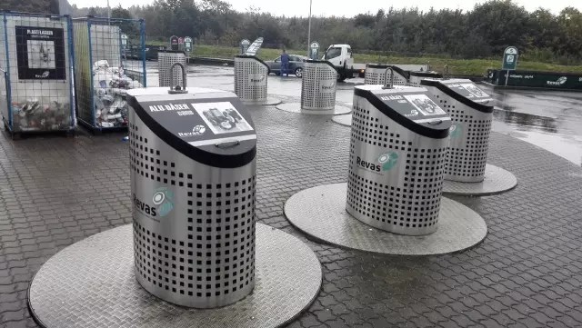 Revas的垃圾分類回收站有一個區(qū)域分布了幾個樣式別致的小垃圾桶,這些小垃圾桶是專供飲料罐和瓶子的,居民直接可通過這些垃圾桶把飲料罐和瓶子扔到地下的大集裝箱中,據Poul M?ller先生介紹,回收站地底下有100個集裝箱箱子用于飲料罐和瓶子的回收。