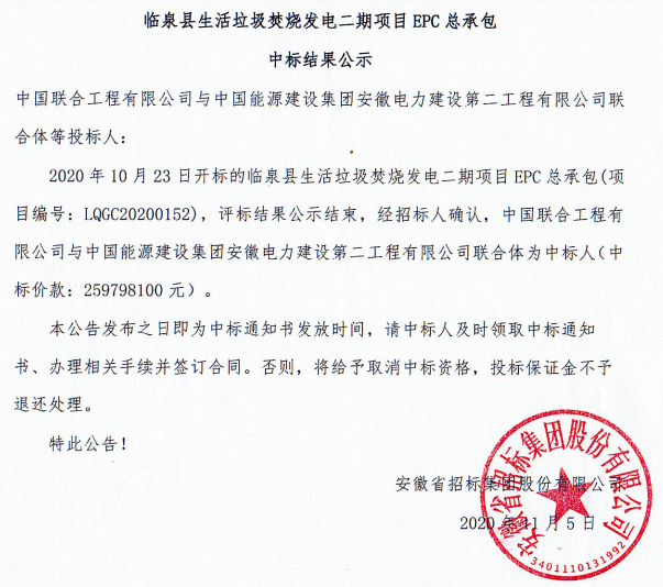 近日,11月5日,安徽省阜陽市臨泉縣生活垃圾焚燒發(fā)電二期項(xiàng)目設(shè)計(jì)施工總承包中標(biāo)結(jié)果公布,中國聯(lián)合工程有限公司與中國能源建設(shè)集團(tuán)安徽電力建設(shè)第二工程有限公司聯(lián)合體中標(biāo)該項(xiàng)目,中標(biāo)金額為25979.8萬元。