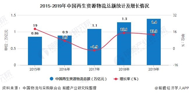 根據(jù)中國物流與采購聯(lián)合會數(shù)據(jù),2015-2019年我國再生資源物流總額穩(wěn)步增長。2019年,再生資源物流總額達到1.4萬億元,按照可比口徑,增長13.3%,國內(nèi)再生資源物流行業(yè)快速發(fā)展。
