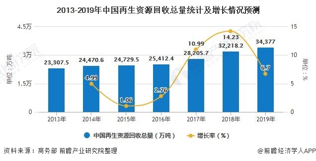 根據(jù)商務(wù)部發(fā)布的《中國再生資源回收行業(yè)發(fā)展報告(2019)》數(shù)據(jù)顯示,2018年,我國廢鋼鐵、廢有色金屬、廢塑料、廢輪胎、廢紙、廢棄電器電子產(chǎn)品、報廢機動車、廢舊紡織品、廢玻璃、廢電池十大類別的再生資源回收總量為3.20億噸,同比增長13.4%。根據(jù)2013-2018年6.7%的年復(fù)合增長率,估算2019年我國再生資源回收總量在34377萬噸左右。