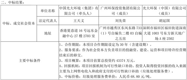 2020年11月19日,邵東市生活垃圾焚燒發(fā)電PPP項(xiàng)目PPP中標(biāo)(成交)公告發(fā)布,正式宣布中國(guó)光大環(huán)境(集團(tuán))有限公司(牽頭人)、廣州環(huán)保投資集團(tuán)有限公司(成員)、光大環(huán)保(中國(guó))有限公司(成員)組成的聯(lián)合體中標(biāo)湖南省邵東市生活垃圾焚燒發(fā)電PPP項(xiàng)目,中標(biāo)價(jià)為垃圾處理服務(wù)費(fèi)68.80元/噸。