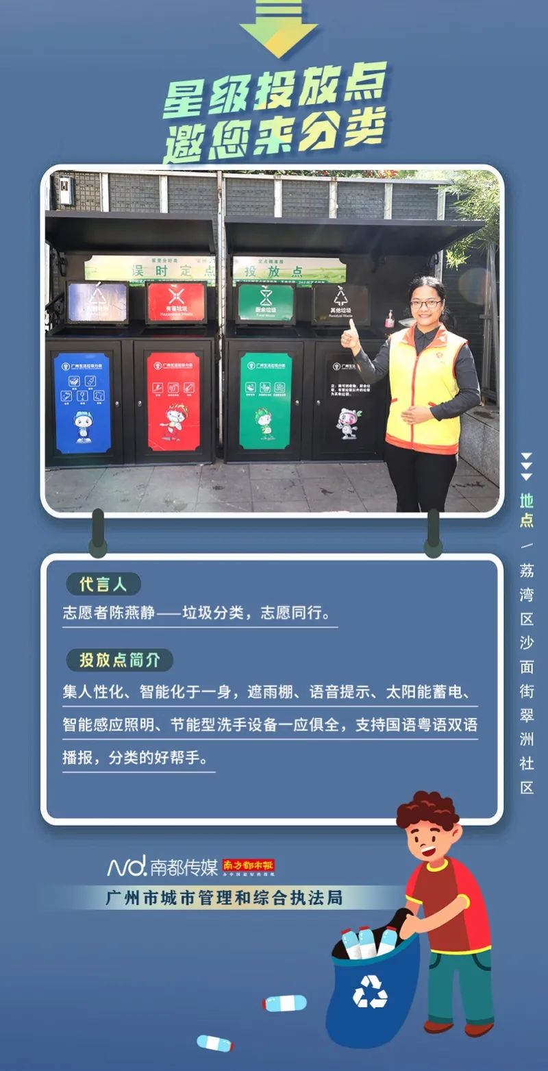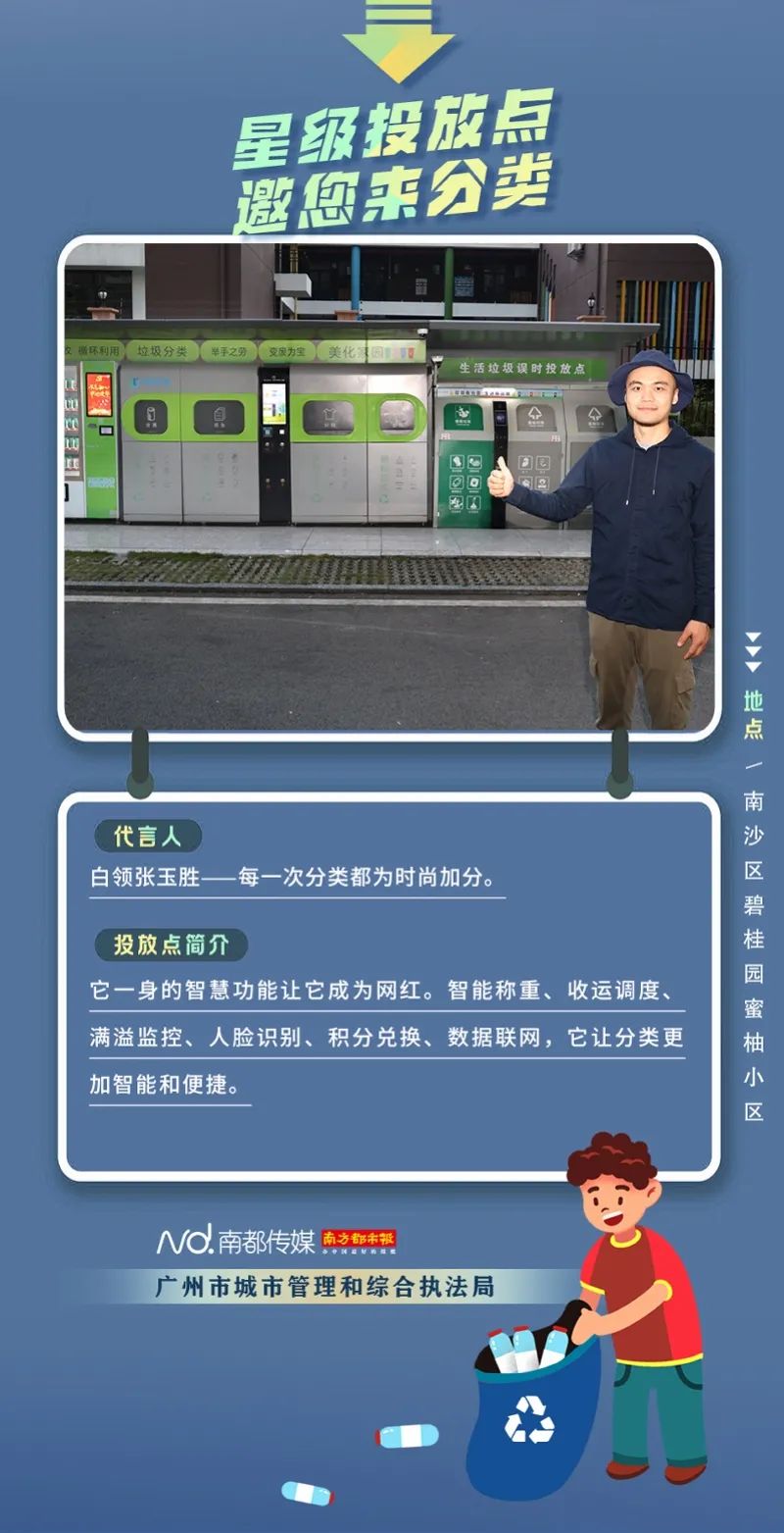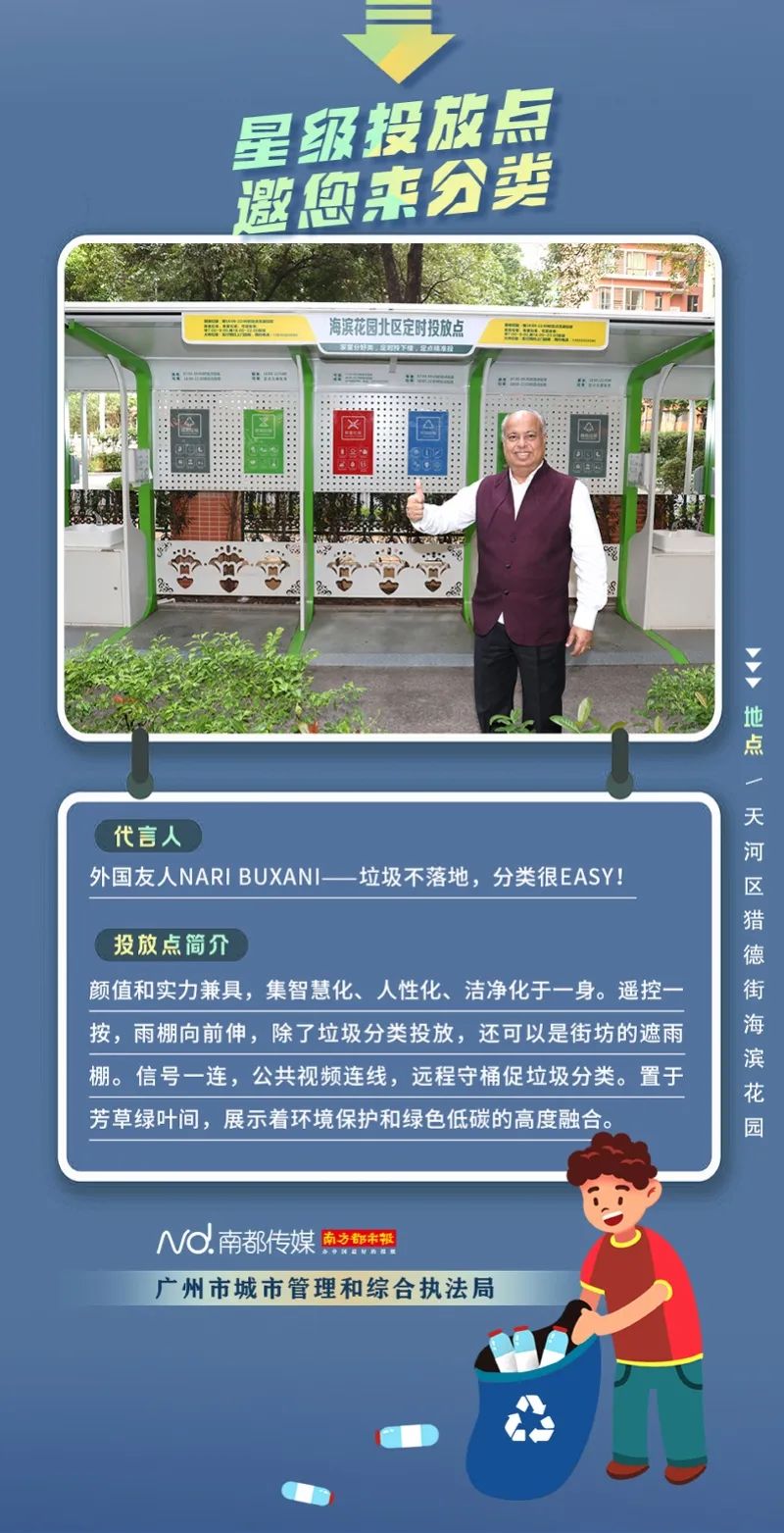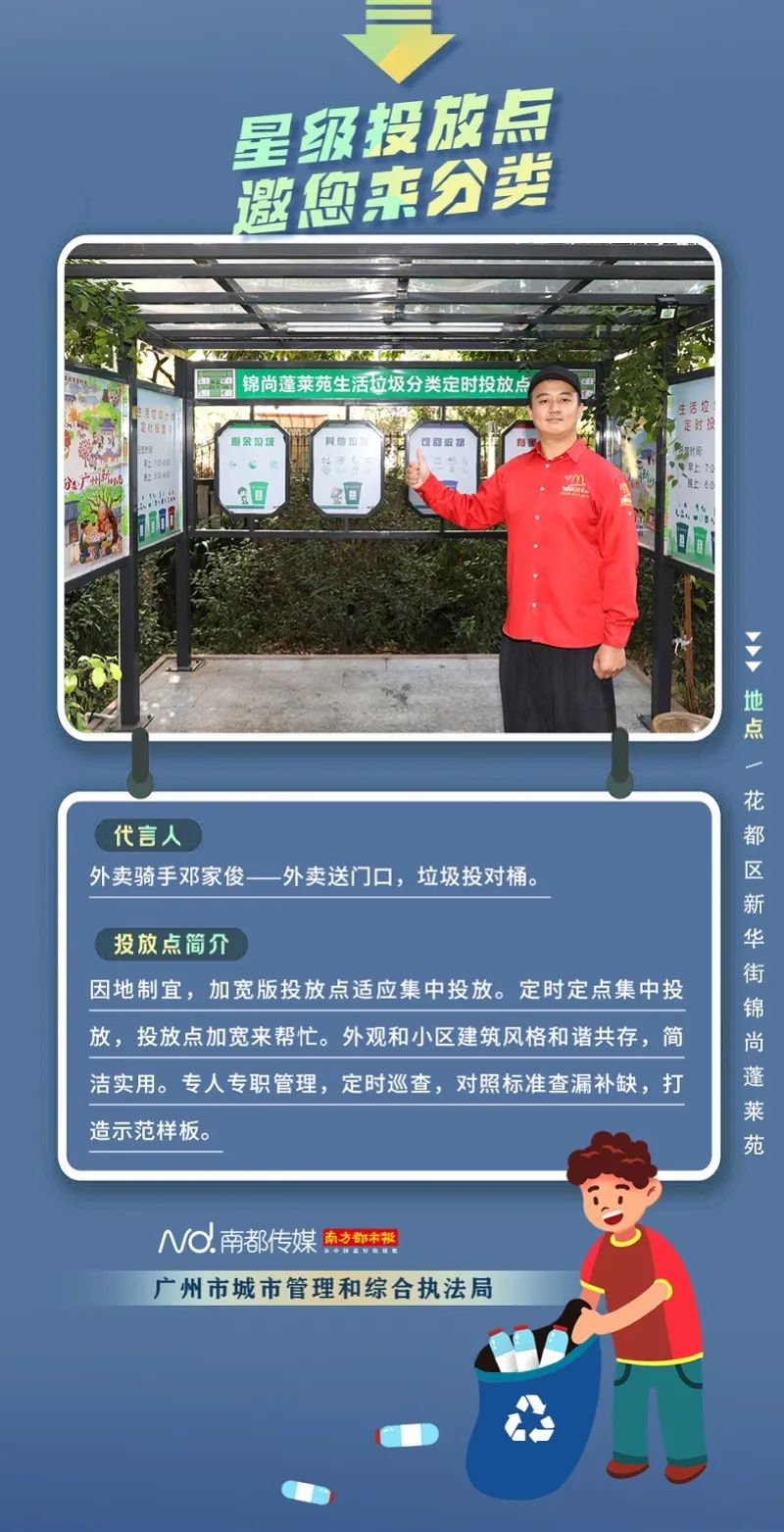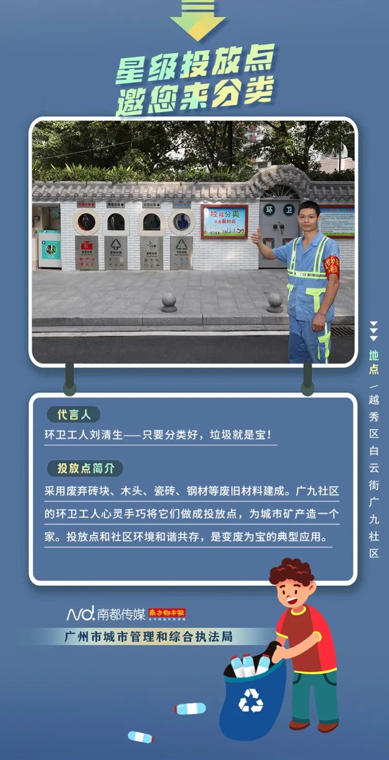 廣州市城市管理和綜合執(zhí)法局聯(lián)合南方都市報(bào)聯(lián)合推出“星級(jí)投放點(diǎn) 邀您來分類”系列海報(bào),從廣州全市11個(gè)行政區(qū)遴選出“星級(jí)投放點(diǎn)”,并邀請(qǐng)來自各行各業(yè)的11位廣州街坊為廣州垃圾分類代言。