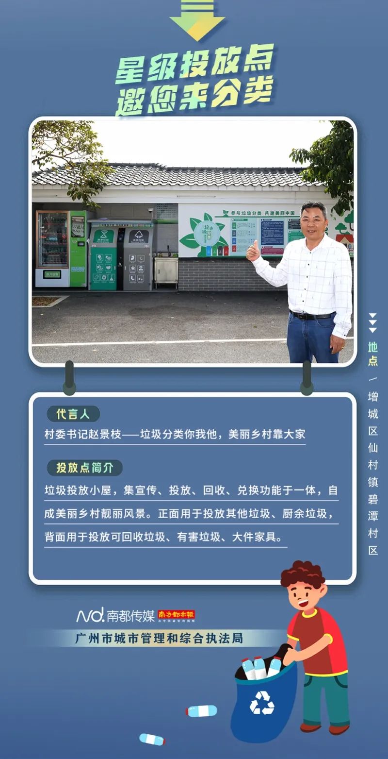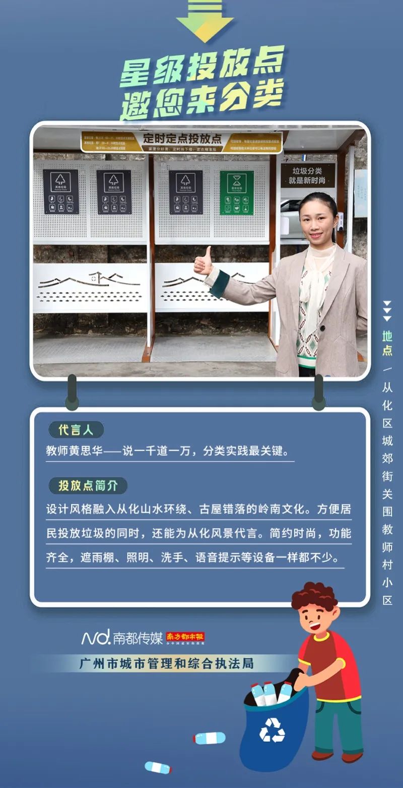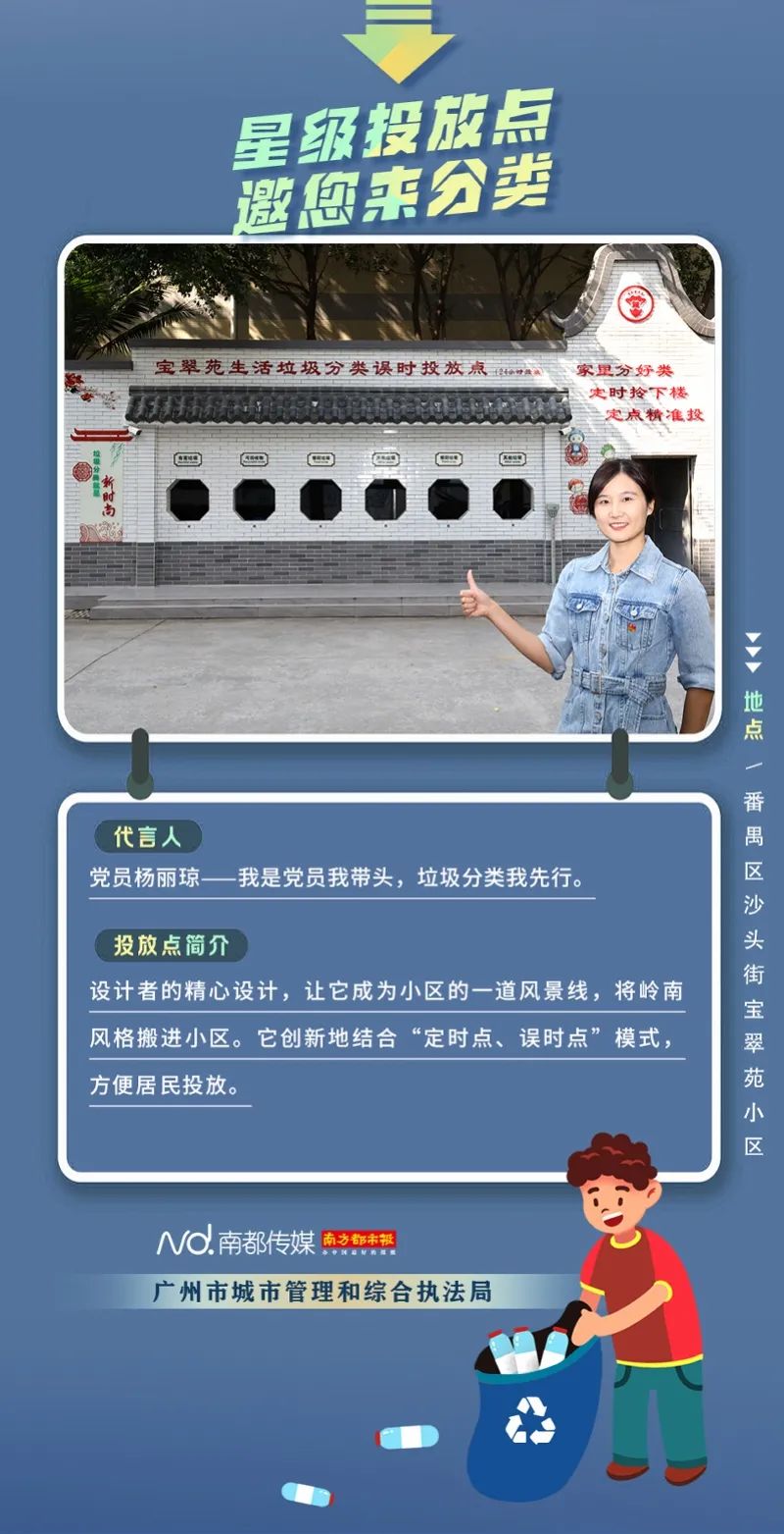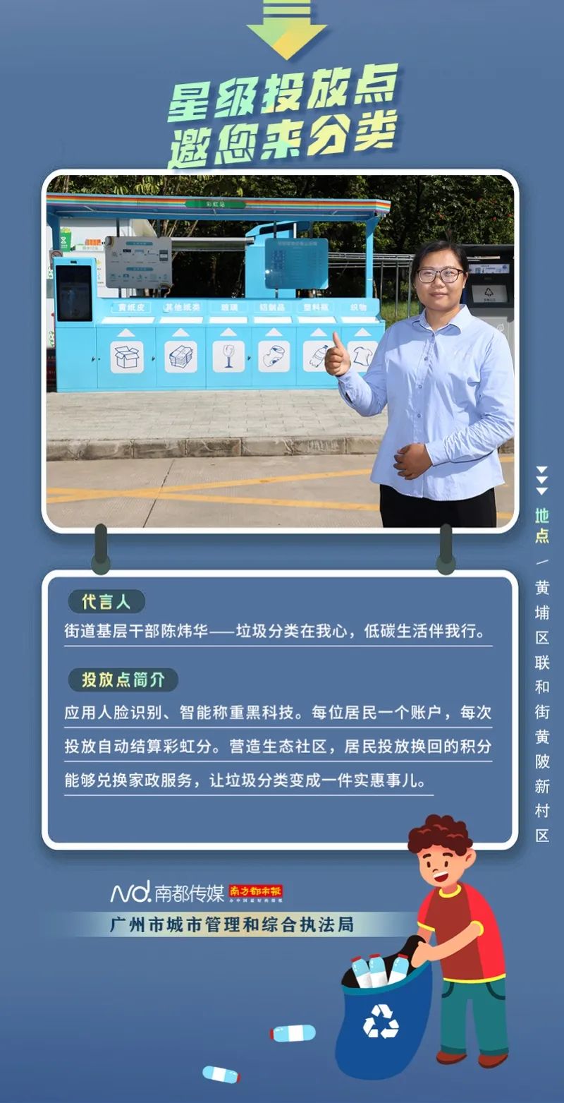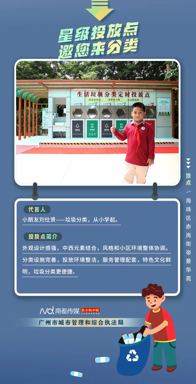 廣州市城市管理和綜合執(zhí)法局聯(lián)合南方都市報(bào)聯(lián)合推出“星級(jí)投放點(diǎn) 邀您來分類”系列海報(bào),從廣州全市11個(gè)行政區(qū)遴選出“星級(jí)投放點(diǎn)”,并邀請(qǐng)來自各行各業(yè)的11位廣州街坊為廣州垃圾分類代言。