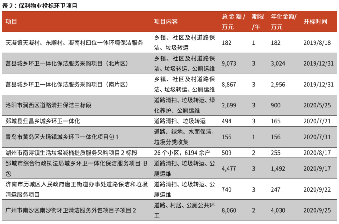 保利物業(yè)則大力發(fā)展環(huán)衛(wèi)項目投標(biāo)業(yè)務(wù)。截止2020年10月底,不完全統(tǒng)計投標(biāo)項目數(shù)量已達到16個。