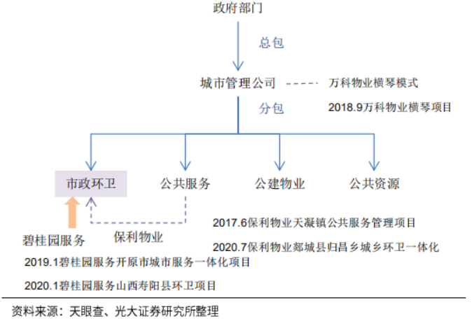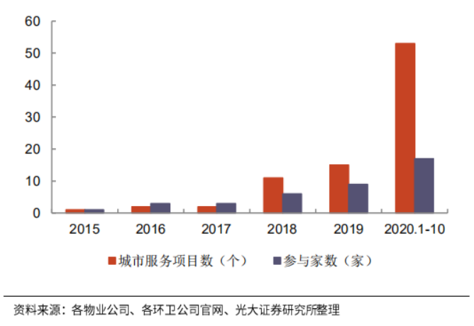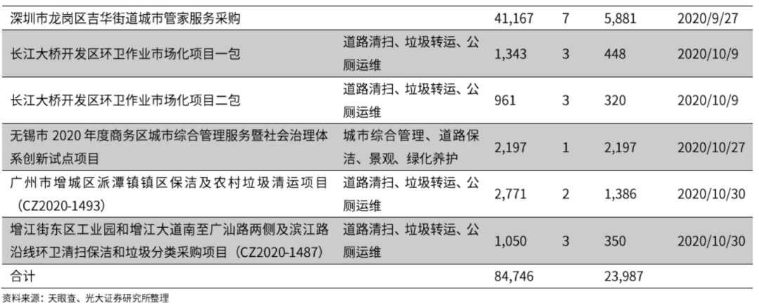 2019-2020年,隨著城市服務(wù)項目不斷增加,物業(yè)企業(yè)下沉至環(huán)衛(wèi)業(yè)務(wù),開始直接參與市場招投標(biāo),或在城市公服的基礎(chǔ)上疊加市政環(huán)衛(wèi)等人力密集型業(yè)務(wù)。綜上,我們認(rèn)為,城市服務(wù)商需要具備環(huán)衛(wèi)為主的市政綜合業(yè)務(wù)能力。