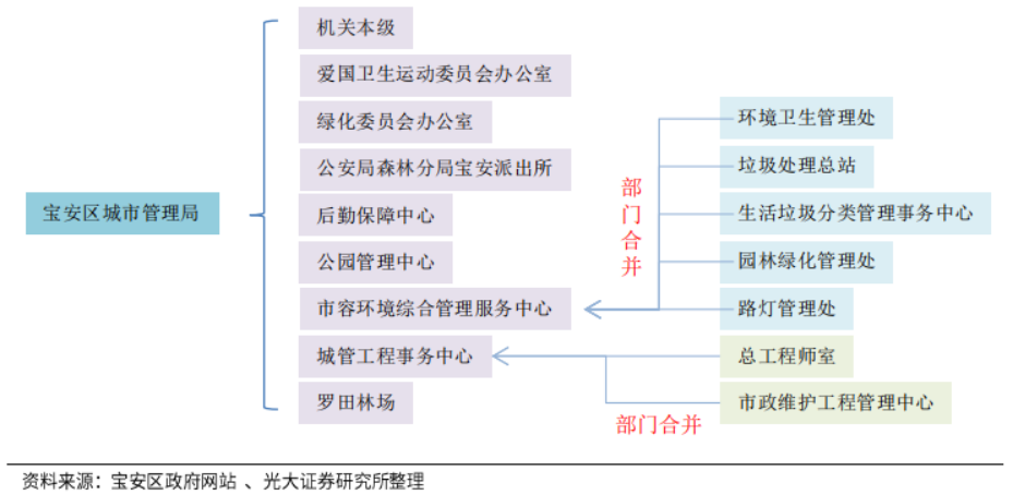深圳市寶安區(qū)城市管理和綜合執(zhí)法局2018年,根據(jù)《關(guān)于整合成立深圳市寶安區(qū)市容環(huán)境綜合管理服務(wù)中心的通知》),深圳市寶安區(qū)城市管理和綜合執(zhí)法局下屬單位環(huán)境衛(wèi)生管理處、垃圾處理總站、生活垃圾分類管理事務(wù)中心、園林綠化管理處、路燈管理處整合成立市容環(huán)境綜合管理服務(wù)中心;根據(jù)《關(guān)于整合成立深圳市寶安區(qū)城管工程事務(wù)中心的通知》,局下屬單位總工程師室、市政維護工程管理中心整合成立城管工程事務(wù)中心。