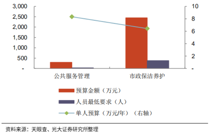 在珠海橫琴新區(qū)物業(yè)城市項目中,2020年前10個月,珠海大橫琴城市公共資源經(jīng)營有限公司當(dāng)年共承接項目金額3.9億元,其中市政環(huán)衛(wèi)、公共物業(yè)管理分別占比79%和19%。以天凝鎮(zhèn)全域化公共服務(wù)管理項目為例,主要分為市政環(huán)衛(wèi)和公服管理兩部分,而公共服務(wù)管理部分的預(yù)算金額和人員最低要求數(shù)量均為市政環(huán)衛(wèi)部分的10%左右。