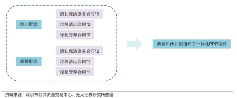 2020年,寶安區(qū)連續(xù)啟動三個環(huán)衛(wèi)一體化項目,即新橋和沙井街道環(huán)衛(wèi)一體化PPP項目、新安、福永和福海街道環(huán)衛(wèi)一體化PPP項目、松崗、燕羅和石巖街道環(huán)衛(wèi)一體化PPP項目。預(yù)計在2022年全區(qū)實現(xiàn)環(huán)衛(wèi)一體化全覆蓋。以新橋和沙井街道環(huán)衛(wèi)一體化PPP項目為例,通過對碎片化招標(biāo)的替代,實現(xiàn)13個服務(wù)合同的合并。