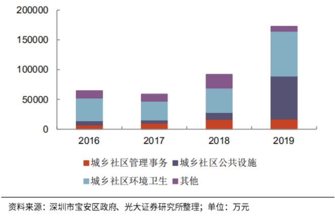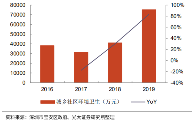 2018年,深圳市寶安區(qū)城市管理局完成部內(nèi)合并,并于2019年更名深圳市寶安區(qū)城市管理和綜合執(zhí)法局。2019年,其年度決算開支同比增速達到88%,其中城鄉(xiāng)社區(qū)公共設(shè)施和城鄉(xiāng)社區(qū)環(huán)境衛(wèi)生支出分別同比增加525%和83%。