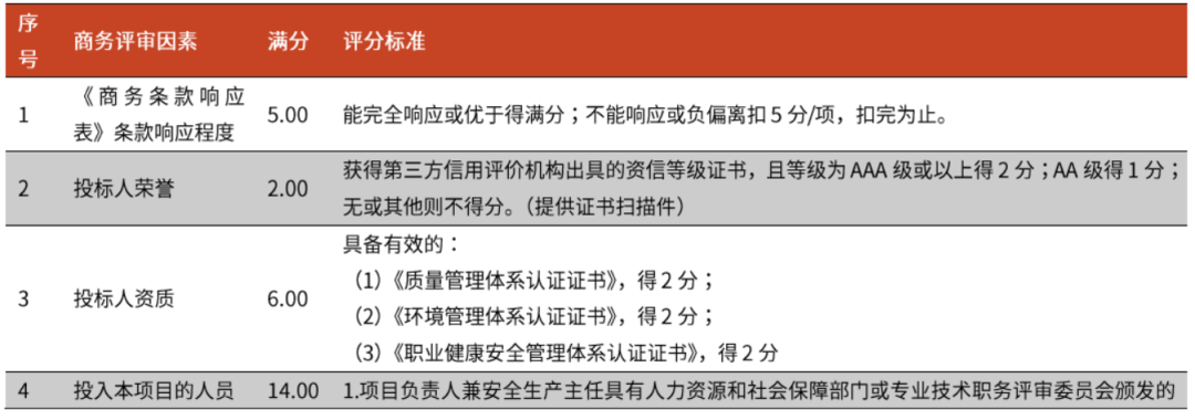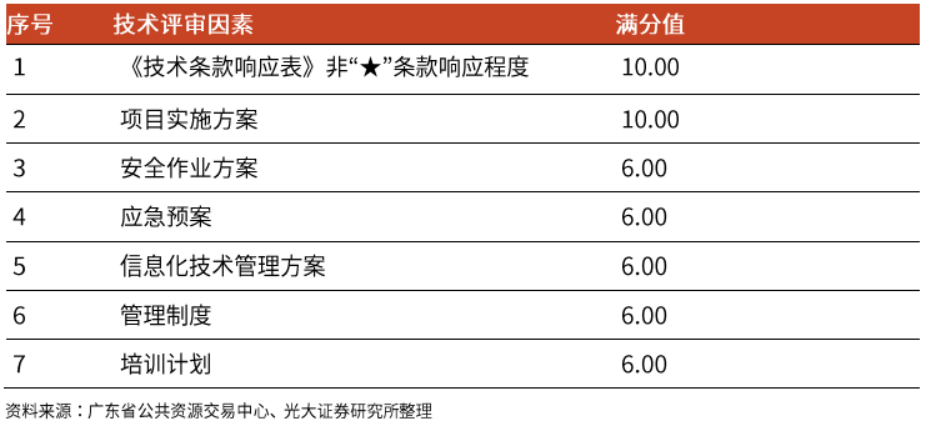 技術(shù)部分評審因素則主要側(cè)重于項目實施方案、應(yīng)急預(yù)案、管理制度、培訓(xùn)計劃等,整體評價過程較為主觀,同時也對投標(biāo)企業(yè)的經(jīng)驗有一定要求。