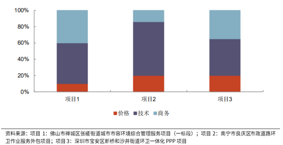 在業(yè)務(wù)內(nèi)容上,環(huán)衛(wèi)業(yè)務(wù)并無明顯的技術(shù)內(nèi)檻。因此,項目的獲取成為企業(yè)發(fā)展的重要環(huán)節(jié)。而環(huán)衛(wèi)項目招投標(biāo)通常采用綜合評標(biāo)法,主要考察商務(wù)、技術(shù)、價格三個方面。在評標(biāo)過程中,技術(shù)因素的權(quán)重占比最高,通常在40%-60%,商務(wù)因素的權(quán)重在20%-40%,技術(shù)價格因素的權(quán)重占比通常在20%以下。