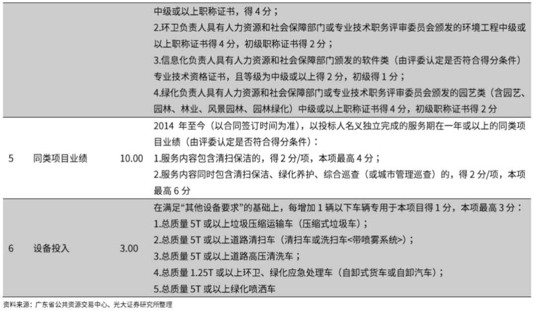環(huán)衛(wèi)一體化PPP項目內(nèi)檻大幅提升在環(huán)衛(wèi)一體化項目及PPP項目中,由于項目整體性增強,需要對一定區(qū)域內(nèi)的市政基礎(chǔ)設(shè)施進行整合,對投標(biāo)企業(yè)的要求較高。如新安、福永和福海街道環(huán)衛(wèi)一體化PPP項目,在商務(wù)和技術(shù)評審因素中加入項目自有資金出資能力、項目投融資能力、經(jīng)營管理盈利能力、自有車輛設(shè)備情況等條件,開始對企業(yè)的資金實力、投融資能力、資產(chǎn)形成要求。因此,從傳統(tǒng)環(huán)衛(wèi)標(biāo)段到環(huán)衛(wèi)一體化及PPP,行業(yè)內(nèi)檻得到了大幅提升,整體有利于資金實力強、背景雄厚的企業(yè)。