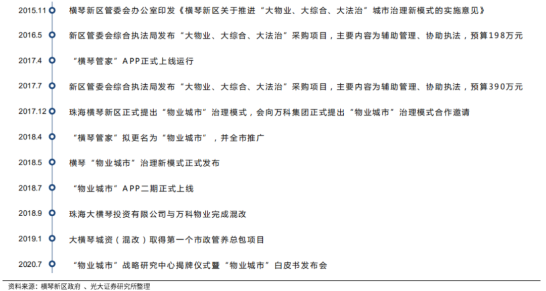 同時,將27大類行政處罰權(quán)和7類審批管理權(quán)限由橫琴新區(qū)綜合執(zhí)法局集中行使。在綜合執(zhí)法局的推動下,橫琴新區(qū)開始推進“大物業(yè)、大綜合、大法治”城市治理新模式,并于2017年上線“橫琴管家”APP。在綜合執(zhí)法局連續(xù)兩年“大物業(yè)、大綜合、大法治”城市治理新模式項目采購的基礎(chǔ)上,橫琴新區(qū)向萬科集團發(fā)出合作邀請。2018年9月,珠海大橫琴投資有限公司與萬科物業(yè)完成混改;2019年1月,大橫琴城資(混改)取得第一個市政管養(yǎng)總包項目,“橫琴模式”順利開展。