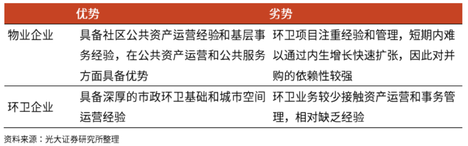 在“城市治理需求外延”主線中,物業(yè)企業(yè)從率先進入公建物業(yè)和公共服務(wù)領(lǐng)域,并逐步培育環(huán)衛(wèi)業(yè)務(wù)能力;而環(huán)衛(wèi)企業(yè)則具備較深厚的市政環(huán)衛(wèi)基礎(chǔ),并向一體化方向拓展,同時嘗試公建物業(yè)和公共服務(wù)。