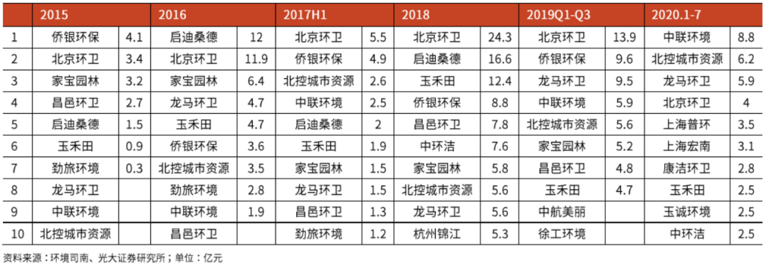綜上,垃圾分類普及的背景下,環(huán)衛(wèi)業(yè)務(wù)成為“中間地帶”的趨勢在增強。而基于業(yè)務(wù)自身屬性,內(nèi)生增長依賴長期同類項目經(jīng)驗累積,收并購有望成為打破現(xiàn)有競爭格局的重要途徑。