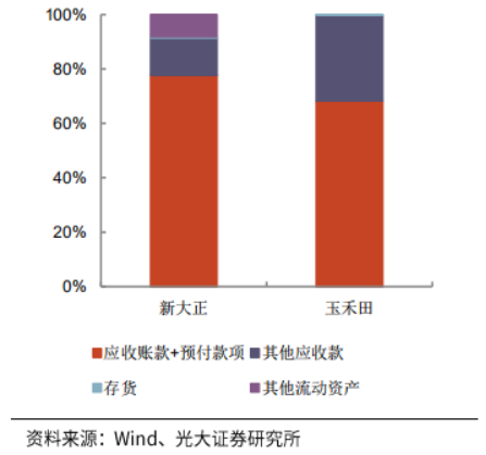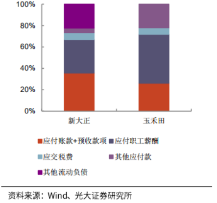 對比環(huán)衛(wèi)運營企業(yè)玉禾田和公建物業(yè)企業(yè)新大正,營業(yè)成本結(jié)構(gòu):新大正80%以上為人工成本,成本占比約等于玉禾田的人工成本和折舊攤銷+設(shè)備使用費占比之和;流動資產(chǎn)結(jié)構(gòu)(除現(xiàn)金外):主要構(gòu)成為應(yīng)收款+預(yù)付款;流動負(fù)債結(jié)構(gòu)(除短期借款外):主要構(gòu)成為應(yīng)付賬款+預(yù)收款、應(yīng)付職工薪酬。