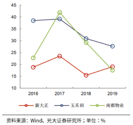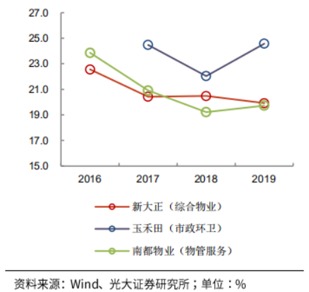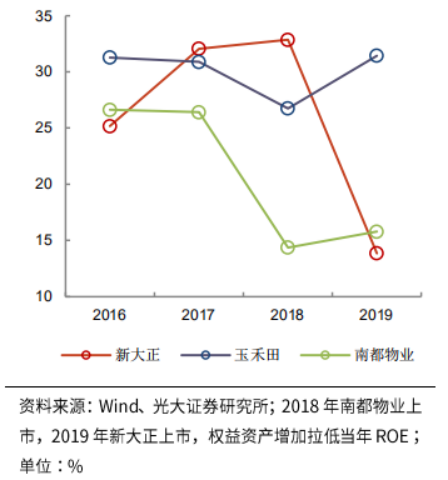 三者主要業(yè)務(wù)毛利率均在18%-25%區(qū)間,凈資產(chǎn)收益率(攤?。┰?5%-35%之間(2018年南都物業(yè)上市,2019年新大正上市,權(quán)益資產(chǎn)增加導(dǎo)致當(dāng)年ROE降低),平均營收增速在15%-30%左右。