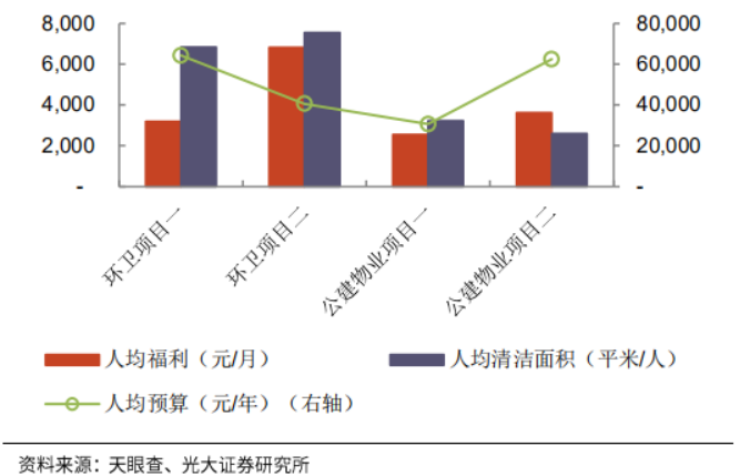 項目層面通過對具體項目的對比,我們發(fā)現(xiàn)環(huán)衛(wèi)項目與公建物業(yè)項目在人均預(yù)算、人均福利方面處于同一水平。