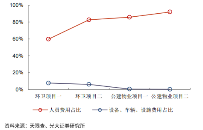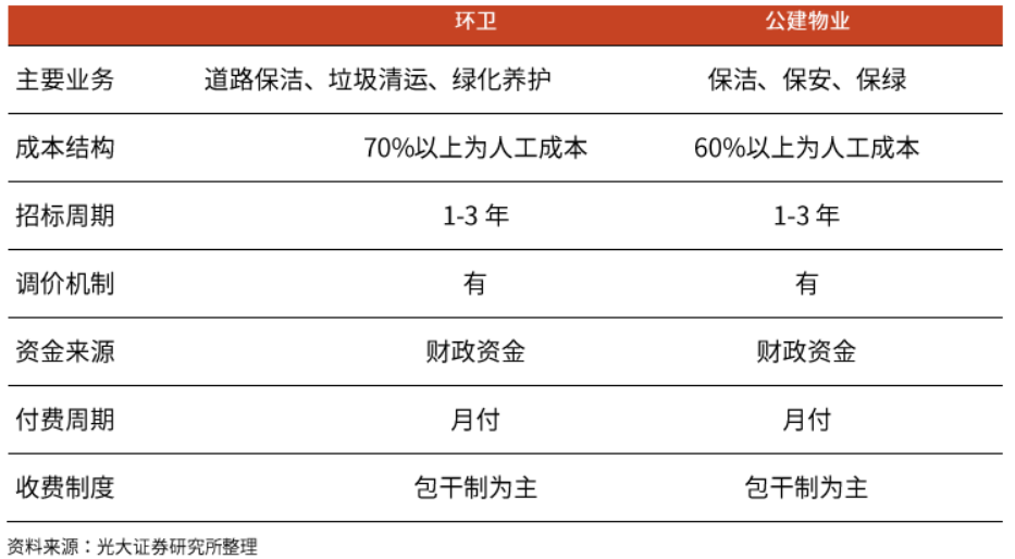 這決定了兩者都屬于人力密集型業(yè)務(wù),在成本結(jié)構(gòu)中人工成本占比60%以上。通常以1-3年為一個招標(biāo)周期,按月支付費用(最終來源為財政資金)。目前兩者都以包干制為主要收費模式,單價確定后盈虧自負(fù),重點考驗企業(yè)的成本控制能力和管理能力。