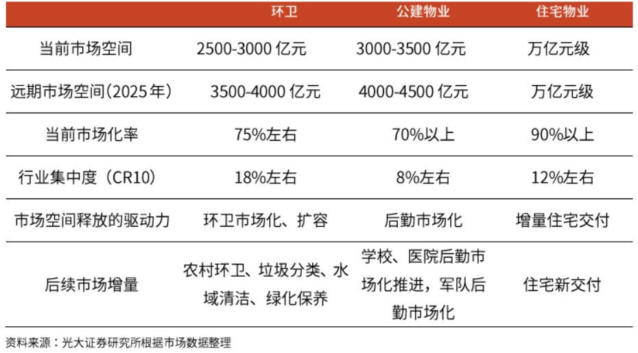 ▼表11:環(huán)衛(wèi)業(yè)務(wù)、公建物業(yè)、住宅物業(yè)的市場空間對比