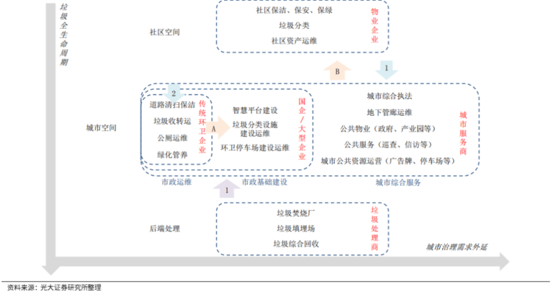 在當(dāng)前的競爭格局下,沿著“垃圾全生命周期”和“城市治理需求外延”兩條主線,環(huán)衛(wèi)正在成為“中間地帶”。
