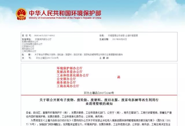 為貫徹落實(shí)《土壤污染防治行動計劃》《國務(wù)院辦公廳關(guān)于印發(fā)禁止洋垃圾入境推進(jìn)固體廢物管理制度改革實(shí)施方案》(國辦發(fā)〔2017〕70號),環(huán)境保護(hù)部聯(lián)合發(fā)展改革委、工業(yè)和信息化部、公安部、商務(wù)部、工商總局開展電子廢物、廢輪胎、廢塑料、廢舊衣服、廢家電拆解等再生利用行業(yè)清理整頓。
