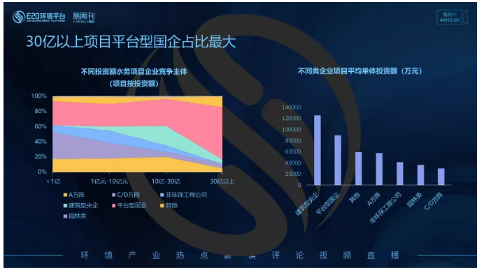 左圖,分析不同投資額區(qū)間水務(wù)項(xiàng)目中標(biāo)企業(yè)類型發(fā)現(xiàn),2020年前三季度,水務(wù)A方陣企業(yè)在小于30億項(xiàng)目中,隨著金額增加占比變化不明顯,當(dāng)項(xiàng)目投資額大于30億,占比明顯減小;C/D方陣企業(yè)則隨著項(xiàng)目投資額增加,占比不斷減小,在<1億的項(xiàng)目中,占比最大,由此說明C/D方陣更傾向投資額相對(duì)較小的項(xiàng)目;平臺(tái)型國(guó)企在各個(gè)投資額區(qū)間均占了較大的市場(chǎng)份額,在30億以上項(xiàng)目中,占比最大,近70%。