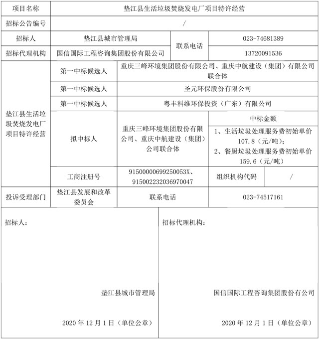 日前,墊江縣生活垃圾焚燒發(fā)電廠項目特許經營中標候選人公示,重慶三峰環(huán)境集團股份有限公司、重慶中航建設(集團)有限公司聯(lián)合體為該項目第一中標候選人,中標金額為生活垃圾處理服務費初始單價107.8元/噸、餐廚垃圾處理服務費初始單價159.6元/噸。
