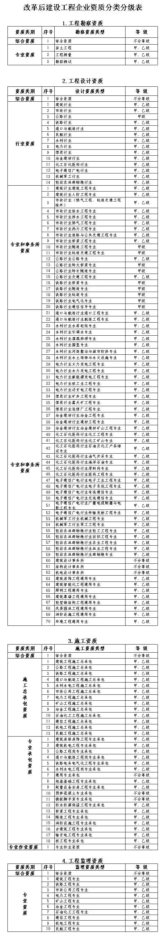《建設工程企業(yè)資質改革措施表》《改革后建設工程企業(yè)資質分類分級表》如下: