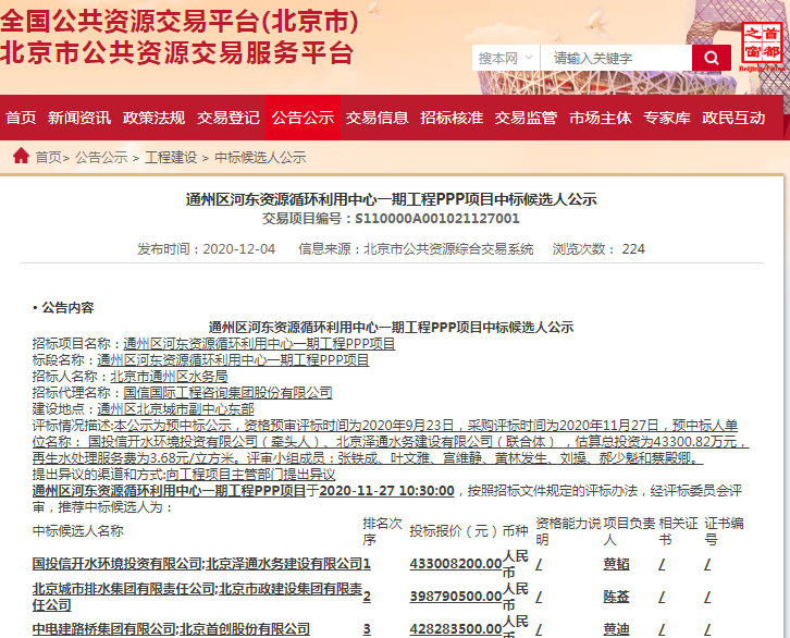 原標題:3.68元/立方米 國投信開水環(huán)境聯(lián)合預中標北京通州河東資源循環(huán)利用中心項目