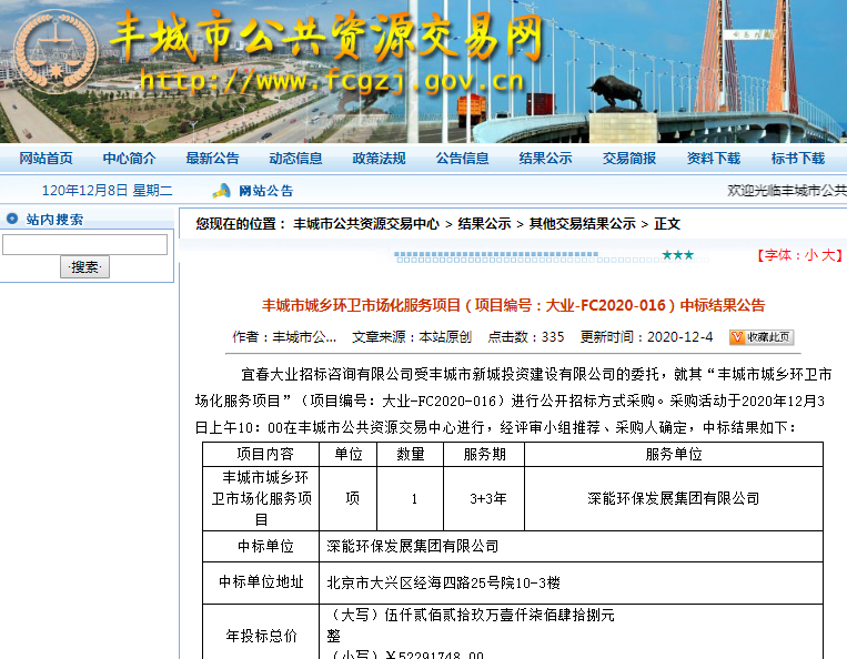 豐城市公共資源交易網(wǎng)發(fā)布豐城市城鄉(xiāng)環(huán)衛(wèi)市場(chǎng)化服務(wù)項(xiàng)目(項(xiàng)目編號(hào):大業(yè)-FC2020-016)中標(biāo)結(jié)果公告,公告顯示,深能環(huán)保發(fā)展集團(tuán)有限公司(簡(jiǎn)稱(chēng)“深能發(fā)展”)中標(biāo)豐城市城鄉(xiāng)環(huán)衛(wèi)市場(chǎng)化服務(wù)項(xiàng)目,年投標(biāo)總價(jià)為52291748元,三年投標(biāo)總價(jià)為156875244元。