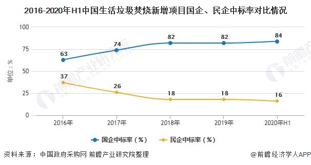數(shù)據(jù)顯示,2016-2020年,垃圾焚燒項目的中標企業(yè)逐步向國企傾斜。2016年,全國垃圾焚燒項目的國企中標率為63%;至2020年上半年,國企中標率提升至84%。