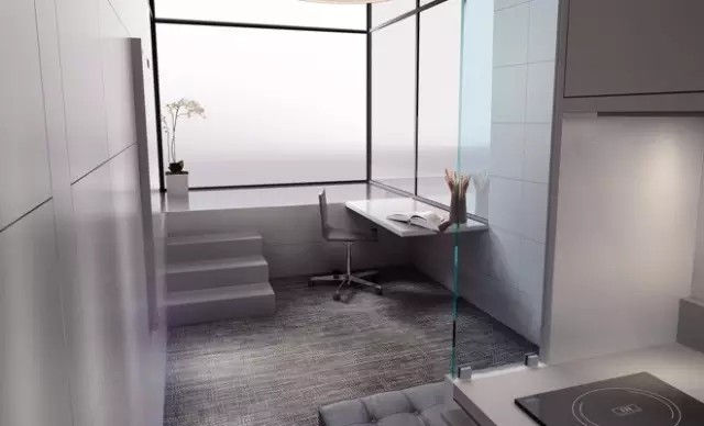 樣板房看上去還是垃圾箱的形狀,格調(diào)卻要高很多。用特殊玻璃SageGlass制成的落地窗,不僅看起來高端大氣上檔次,還能根據(jù)室外陽光強度自動遮光。