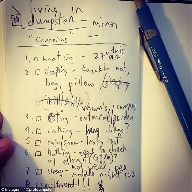 他飛跑去向教務(wù)長申請: “我想把校園草坪上的垃圾箱變成一個微小的可持續(xù)的家,并到里面去住?!?教務(wù)長雖然不是很懂這個教授的腦回路,但是想想垃圾箱也不貴,就同意了。