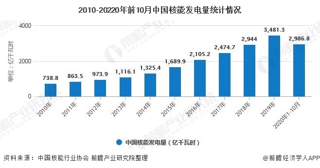 隨著我國核電項目陸續(xù)完工投產(chǎn),核電應(yīng)用進(jìn)一步推廣,我國核電發(fā)電量保持增長的趨勢。2019年,我國核能發(fā)電量為3481.31億千瓦時,同比增長18.09%。截止至2020年1-10月中國核能發(fā)電量產(chǎn)量累計達(dá)到2986.8億千瓦時,累計增長5.7%。