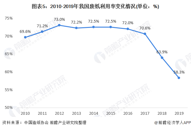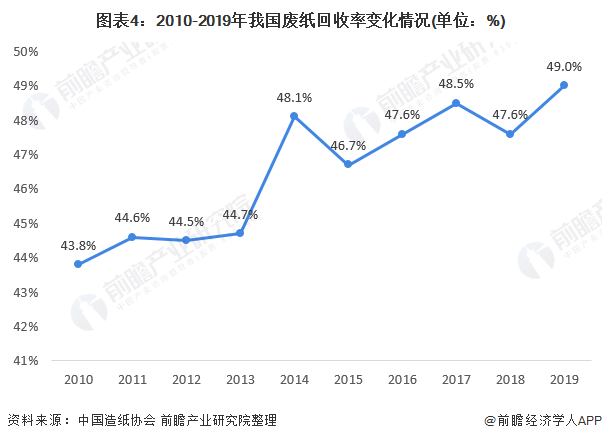 此前,國內(nèi)廢紙的回收率一直沒有改善,而且回收的廢紙也大量被技術(shù)落后的小企業(yè)加工成紙板、衛(wèi)生紙等低檔次產(chǎn)品,沒有發(fā)揮廢紙的資源價值,還帶來嚴重的二次污染。產(chǎn)業(yè)化水平低的根源在于廢紙再生產(chǎn)業(yè)扶持政策缺乏力度,但產(chǎn)業(yè)基礎(chǔ)差也是一個重要制約因素。但近年來,隨著國民環(huán)保意識的調(diào)高和垃圾分類的推廣,我國廢紙回收率波動上升,2019年,我國廢紙回收率達到49.0%,實現(xiàn)10年間廢紙回收率的新高。