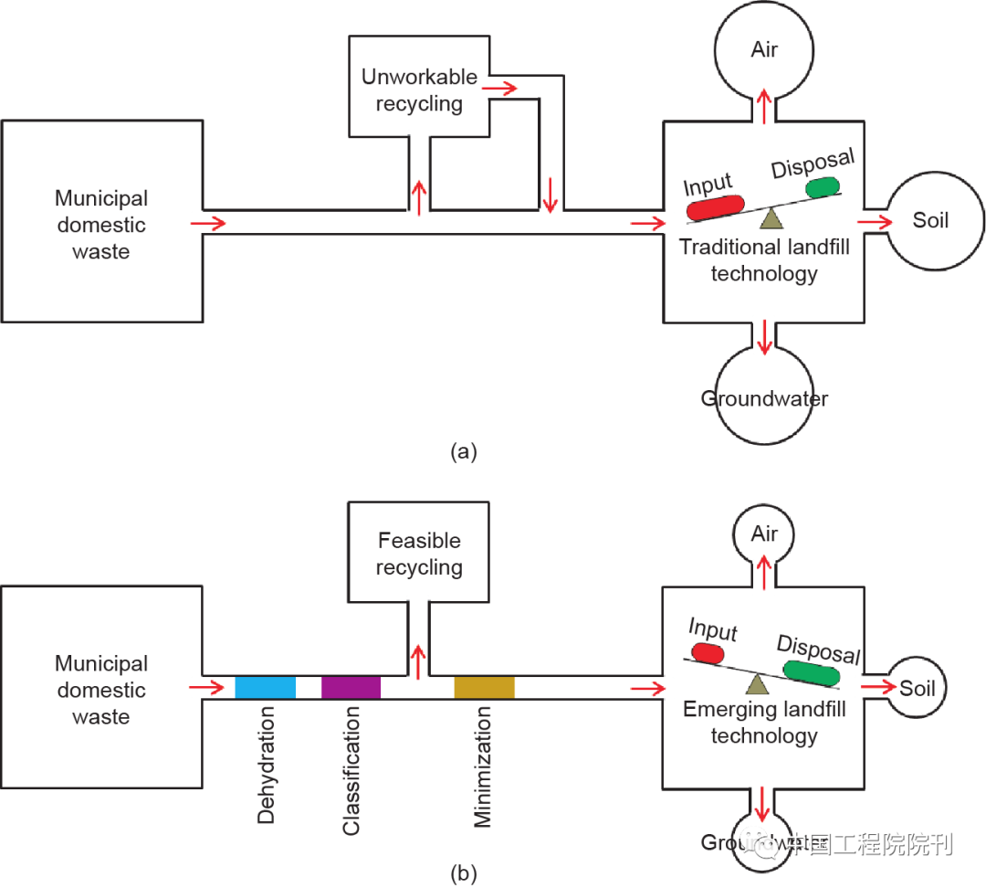 如何解決生活垃圾資源化循環(huán)不平衡、污染防治失控等關(guān)鍵問題,已成為社會(huì)、經(jīng)濟(jì)、環(huán)境保護(hù)和科技關(guān)注的焦點(diǎn)。近年來,我國政府高度重視改善環(huán)境問題,并加大了對(duì)生活垃圾處理的投資,這對(duì)于我國進(jìn)一步推行綠色發(fā)展模式具有重要意義。在本文中,筆者強(qiáng)調(diào)城市生活垃圾全過程處理的重要性[圖1(b)],并分別對(duì)生活垃圾處理前端的分類、減量化與資源化技術(shù),以及末端的污染物快速消化、防泄漏與修復(fù)技術(shù)提出新思路和新建議。