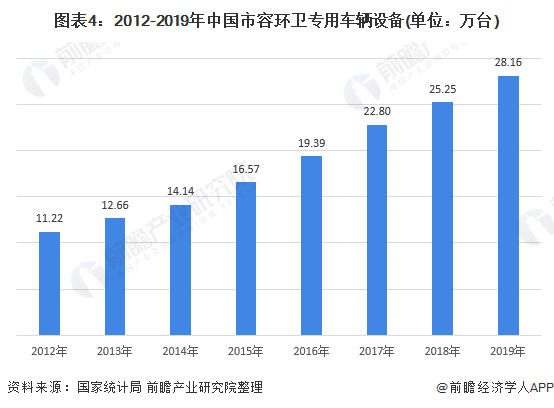 隨著我國道路清掃規(guī)模和生活垃圾清運規(guī)模擴大,環(huán)衛(wèi)用車需求不斷增加。環(huán)衛(wèi)作業(yè)車主要包括灑水車、洗掃車、護欄清洗車、掃路車、垃圾運輸車等。從我國市容環(huán)衛(wèi)專用車輛設備來看,2019年中國市容環(huán)衛(wèi)專用車數量達到28.16萬臺,2012-2019年年均復合增長率為14.05%。
