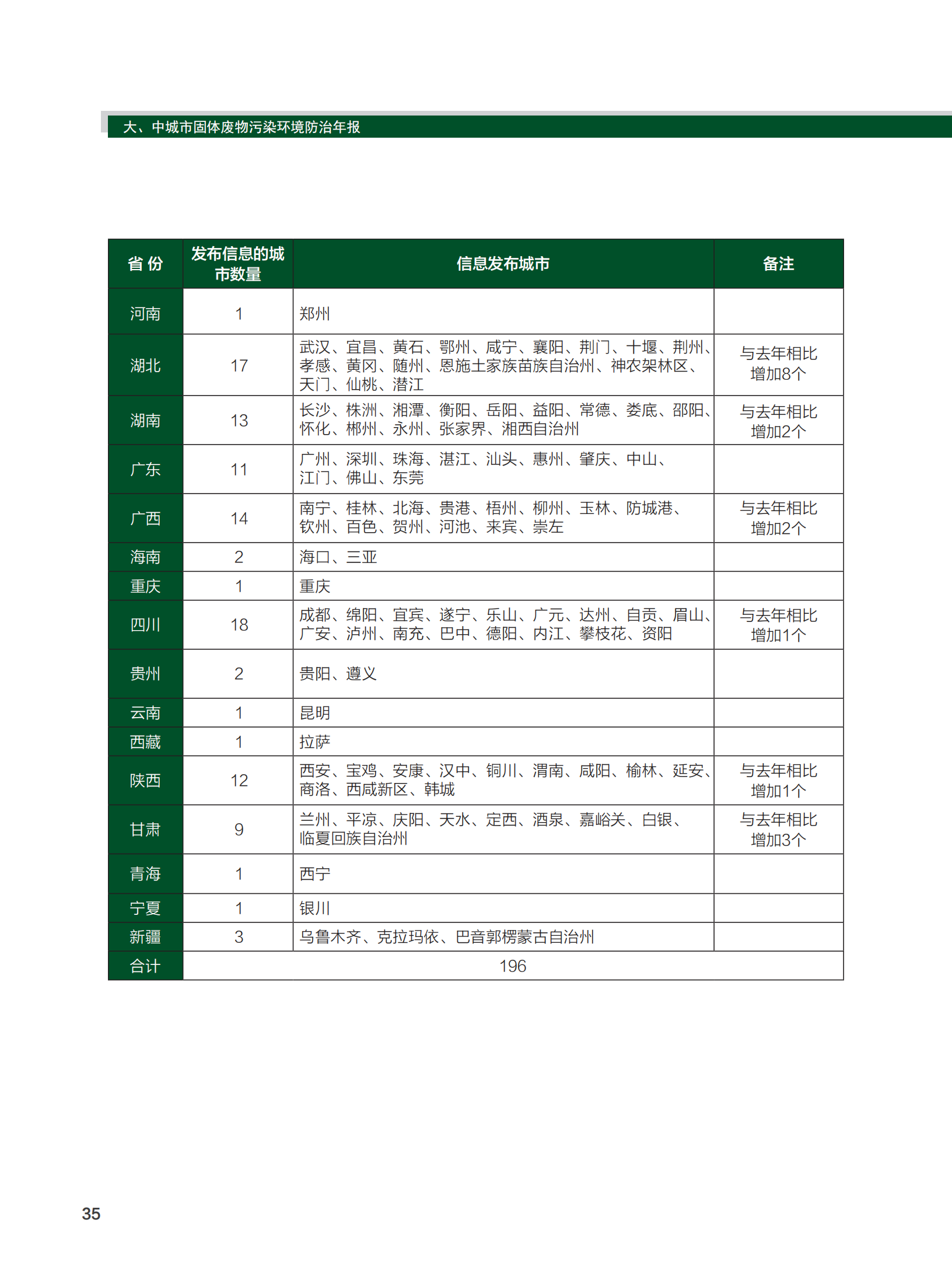 2020年,全國(guó)共有196個(gè)大、中城市向社會(huì)發(fā)布了2019年固體廢物污染環(huán)境防治信息。其中,應(yīng)開展信息發(fā)布工作的47個(gè)環(huán)境保護(hù)重點(diǎn)城市和53個(gè)環(huán)境保護(hù)模范城市均已按照規(guī)定發(fā)布信息,另外還有96個(gè)城市自愿開展了信息發(fā)布工作(詳見附表一)。