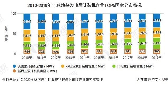 從全球地?zé)岚l(fā)電累計(jì)裝機(jī)容量區(qū)域來看,位于TOP5的國(guó)家分別為美國(guó)、印度尼西亞、菲律賓、土耳其、新西蘭,2019年底地?zé)岚l(fā)電累計(jì)裝機(jī)容量分別為2555MW、2131MW、1928MW、1515MW、965MW,位于TOP5的國(guó)家的地?zé)岚l(fā)電累計(jì)總裝機(jī)容量約占全球的65.28%。