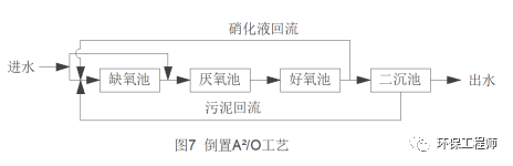 與常規(guī)的A2/O工藝相比,倒置A2/O工藝(見圖7)從前往后以此為缺氧-厭氧-好氧,該工藝的設(shè)計初衷是為了降低污泥回流中硝態(tài)氮對厭氧釋磷的影響,特別是對于高氨氮廢水污泥回流中攜帶有大量的硝氮,抑制厭氧釋磷反應(yīng)。同時,為了解決碳源分配的問題,采用兩點(diǎn)進(jìn)水的方式來提供厭氧釋磷中有機(jī)物的消耗。
