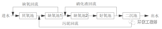 該工藝的主要目的是優(yōu)化除磷效果,第二個缺氧池進(jìn)水中含有一定量的碳源,該部分碳源反硝化速率較高,在該部分碳源消耗殆盡后,還可進(jìn)行內(nèi)源呼吸反硝化,雖然反硝化速率較低,但可進(jìn)一步提高TN的去除率。