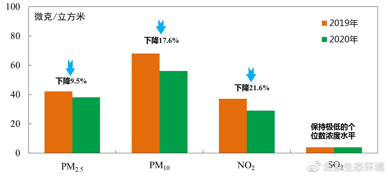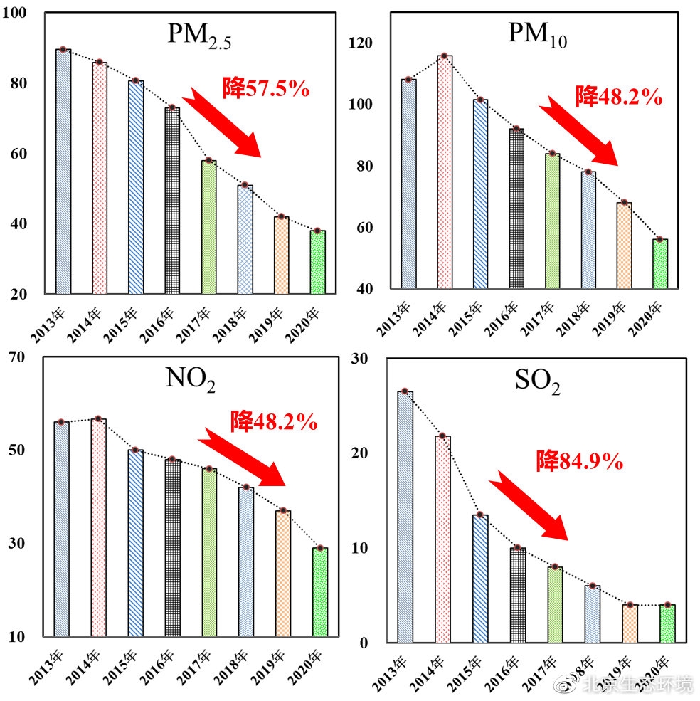 2020年北京市大氣環(huán)境中PM2.5等四項(xiàng)主要污染物同比均明顯改善,其中PM2.5年均濃度為38微克/立方米,首次達(dá)到“30+”水平,同比下降9.5%;可吸入顆粒物(PM10)、二氧化氮(NO2)連續(xù)兩年達(dá)到國家二級(jí)標(biāo)準(zhǔn);二氧化硫(SO2)年均濃度穩(wěn)定達(dá)到國家標(biāo)準(zhǔn)并保持個(gè)位數(shù)水平。