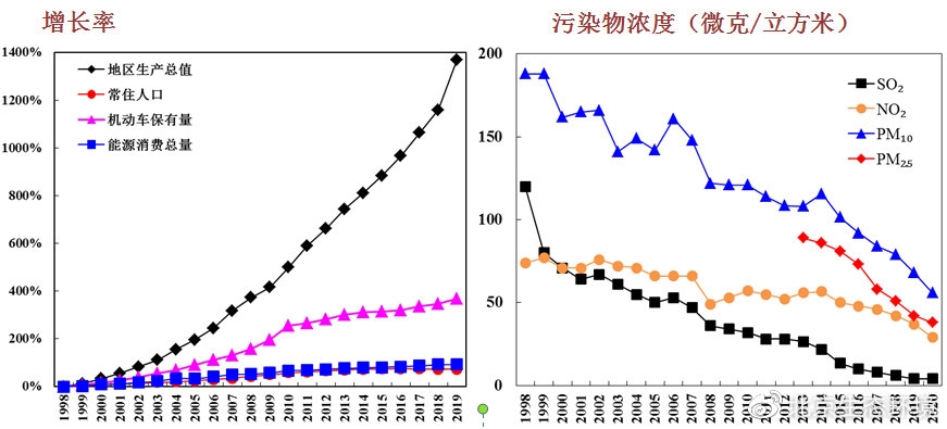 (圖10 1998年以來北京市地區(qū)生產(chǎn)總值、常住人口、機(jī)動(dòng)車保有量、能源消耗總量增速與各項(xiàng)污染物濃度變化趨勢(shì))