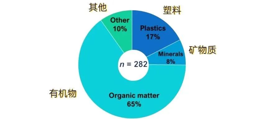 樣本中發(fā)現(xiàn)的塑料中有75%以上是由聚乙烯制成的,研究人員認(rèn)為其可能來(lái)自破損的捕魚(yú)設(shè)備,水瓶蓋,家用器具,塑料袋,塑料容器和包裝。