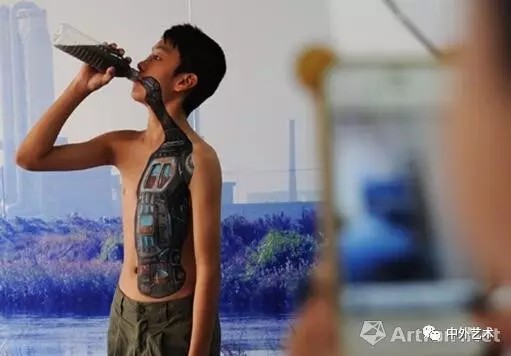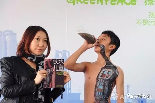 在上海第二屆廣告人藝術(shù)展上,由全球環(huán)保公益組織“綠色和平”等創(chuàng)意展示的行為藝術(shù)--“飲水兒童”讓現(xiàn)場觀眾頗具視覺的震撼,藝術(shù)家通過在模特兒童身上創(chuàng)意畫出宛如人體內(nèi)臟的一個(gè)“水污染處理器”圖案,以此警示,污染飲用水對人類所造成的無法彌補(bǔ)的傷害,引發(fā)社會對水污染問題的關(guān)注和重視。