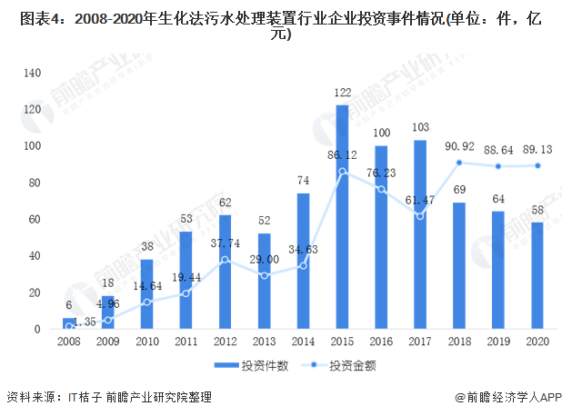 根據(jù)IT桔子的數(shù)據(jù)顯示,2008-2020年生化法污水處理裝置行業(yè)企業(yè)投資事件呈現(xiàn)波動趨勢。在2015年,生化法污水處理裝置行業(yè)企業(yè)投資事件達(dá)到近年來峰值122件,但投資金額為86.12億元。從投資金額角度來看,在2018年,生化法污水處理裝置行業(yè)企業(yè)投資達(dá)到了近年來峰值90.92億元。