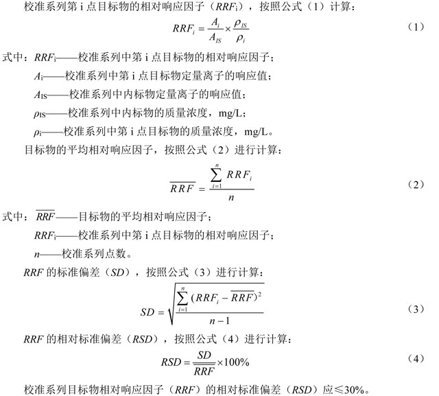 通過樣品中目標(biāo)物與校準(zhǔn)系列中目標(biāo)物的保留時間、特征離子質(zhì)荷比及其豐度比等信息比較,對目標(biāo)物進(jìn)行定性。樣品中目標(biāo)物的相對保留時間與校準(zhǔn)系列中該化合物的相對保留時間的差值應(yīng)在±0.03以內(nèi)。樣品中目標(biāo)物的定性離子相對于定量離子的相對豐度與校準(zhǔn)系列中該化合物的相對豐度比較,其相對偏差應(yīng)在±30%以內(nèi)。