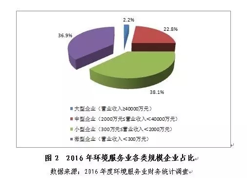 同時(shí),因環(huán)境服務(wù)業(yè)發(fā)展態(tài)勢(shì)向好且門檻較低而受到社會(huì)資本追捧,一些在傳統(tǒng)行業(yè)嚴(yán)重虧損或被迫退出的企業(yè)轉(zhuǎn)而進(jìn)入環(huán)境服務(wù)領(lǐng)域。從統(tǒng)計(jì)結(jié)果看,2016年,大型企業(yè)(以營(yíng)業(yè)收入劃分)超過(guò)百家,但占比較上年下降0.2%,小微企業(yè)占比較上年小幅上升1%,達(dá)到75%。環(huán)境服務(wù)業(yè)仍以小微型規(guī)模經(jīng)濟(jì)單位為主體,行業(yè)分散的狀況未見(jiàn)明顯改善。